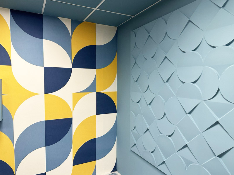 В клиентских зонах монтируются подвесные потолки с повышенной звукоизоляцией (NRC не менее 0,7). Освещение организуется с применением светильников с цветовой температурой 4000-4500К и коэффициентом пульсации не более 5%. Особое внимание уделяется системам навигации и эргономике пространства с учетом требований доступной среды, включая тактильные указатели и контрастную маркировку.